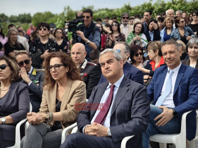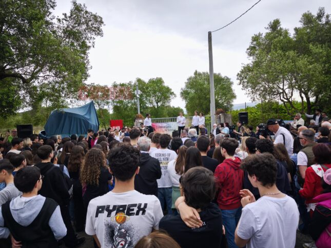 Dal 2016 ogni anno Vincenzo ricorda nel luogo della scomparsa la sorella. Un evento ma così partecipato come oggi, in cui sono state inaugurate la stele in ricordo di Maria e l’opera dell’artista Luigi Camarilla, che ha trasformato il vecchio cancello in un monumento a spirale, come metafora della rete creata attorno al dolore della sua morte. Lì sorgerà un giardino progettato da studenti, un luogo che vuole essere un punto di riferimento di legalità e cultura. «Quel cancello – afferma Vincenzo – che doveva essere il simbolo dell’orrore, è invece il simbolo della rinascita. Studenti, associazioni, amministrazioni, pezzi dello Stato, le forze dell’ordine, il governo, tutti insieme per contrastare in modo fermo e deciso contro la violenza, contro la criminalità organizzata, contro quel femminicidio di stampo mafioso che nessuno qui ha accettato. Continueremo negli anni a dire che queste sono terre libere, non sono controllate né dalla violenza, né dal patriarcato, né dalla criminalità organizzata. E saremo qui sempre con gli studenti, con tutti voi che grazie, che amplificate i nostri appelli e fate parte di questa rete. È una rete così fitta che nessuno riuscirà a varcare». Un’opera d’arte, aggiunge ancora il figlio Vincenzino, «che testimonia che il cambiamento di questa terra è già iniziato». (ma.ru.)