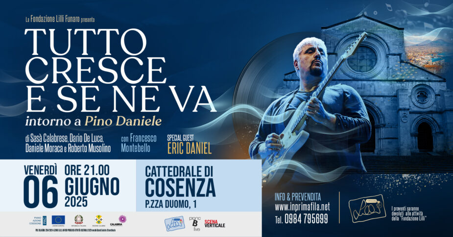 COSENZA Una serata dedicata alla musica, alla memoria e alla cura, con uno spettacolo originale prodotto da Scena Verticale – una prima assoluta – scritto per Lilli e interpretato da Sasà Calabrese, Dario De Luca, Daniele Moraca e Roberto Musolino, con Francesco Montebello. A completare il gruppo ci sarà Eric Daniel, special guest della serata, eccezionale e ricercato sassofonista americano con alle spalle una carriera internazionale e collaborazioni con artisti come Zucchero, Natalie Cole, Andrea Bocelli, Joe Cocker, Antonello Venditti, George Benson, Paul Young, Giorgia, Stevie Wonder, tra molti altri. La sua adesione al progetto porta un contributo artistico importante, pienamente in sintonia con il tono e lo spirito della serata. Al centro dello spettacolo c’è la figura di Pino Daniele. Le sue canzoni, i suoi testi, il suo modo di osservare il mondo, diventano un racconto in equilibrio tra musica e parole, che attraversa alcune fasi specifiche della carriera del cantautore napoletano in cui ha sempre cercato di tenere insieme la disillusione e la possibilità. Nelle contraddizioni di Napoli, ha riconosciuto fragilità e resistenze, continuando a coltivare la fiducia verso ciò che può ancora nascere. È questo sguardo che rende oggi il suo repertorio particolarmente vicino al tema del Giubileo, dedicato proprio alla speranza.