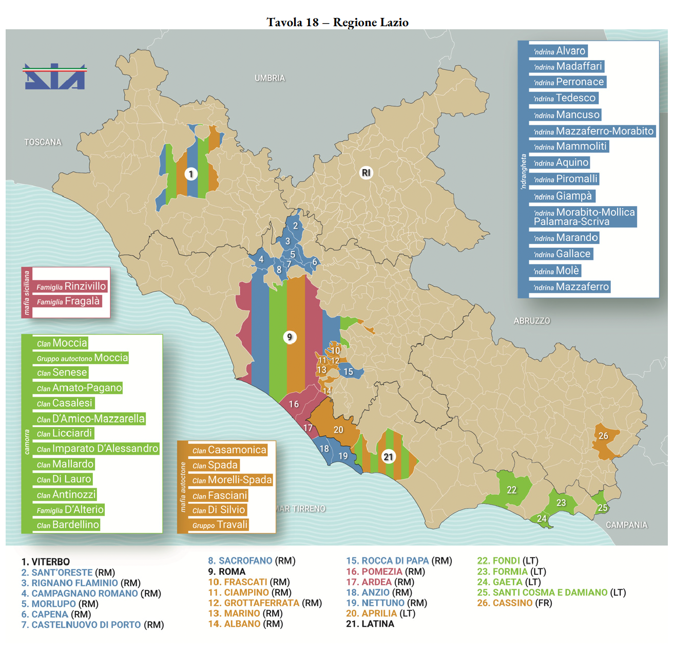 Sono diversi i clan le cui proiezioni hanno da tempo raggiunto il territorio romano. Fra i sodalizi originari di Comuni in provincia di Reggio Calabria si segnalano le ‘ndrine Alvaro-Carzo di Sinopoli, seppur indebolite dalle recenti attività di contrasto, Gallico di Palmi, Pelle- Vottari, Pizzata, Nirta e Strangio di San Luca, Marando di Platì, Bellocco di Rosarno, Morabito di Africo Nuovo (i cui tentativi di ingerenza si concentrano prevalentemente nell’area a Nord di Roma e in particolare nei Comuni di Morlupo, Rignano Flaminio, Riano, Castelnuovo di Porto e Capena), Bruzzaniti di Africo, Mammoliti di Oppido Mamertina e Castellace, Piromalli e Molè di Gioia Tauro, e Mazzagatti di Oppido Mamertina (nella zona dei Castelli Romani).