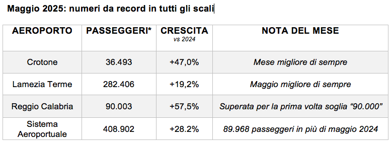 Il solo mese di maggio ha fatto registrare 408.902 passeggeri, con una crescita del +28,2% rispetto a maggio 2024, spinta da performance record in tutti e tre gli scali gestiti da Sacal: Lamezia Terme, Reggio Calabria e Crotone.