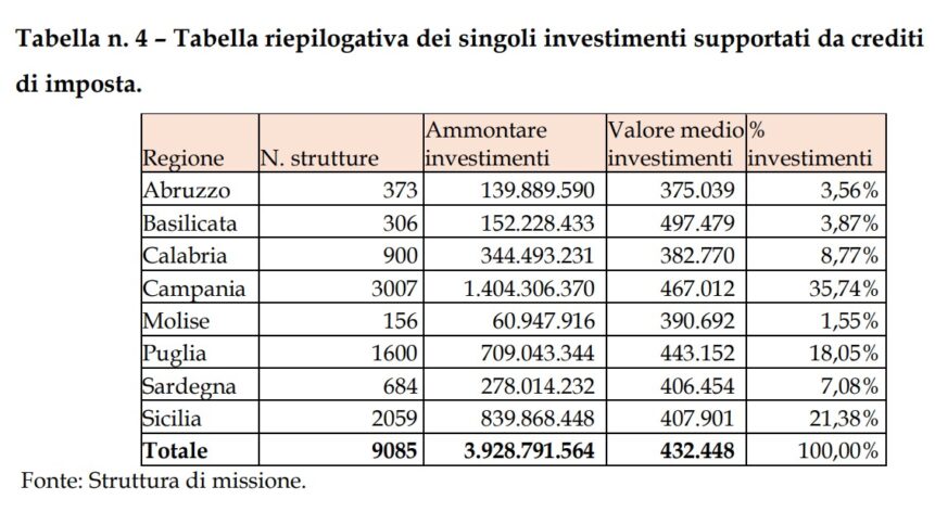 Con riferimento all’autorizzazione unica, sulla base dei dati della Struttura di missione Zes la Corte dei Conti specifica che «nel 2024, risultano pervenute 866 istanze di autorizzazione unica, di cui numero 723 dal 1° marzo 2024. Nel medesimo anno, risultano essere stati emessi 416 provvedimenti di accoglimento (relativi anche a istanze presentate nel corso del 2022 e del 2023)… Dal 1° gennaio al 9 aprile 2025, risultano pervenute 260 domande di autorizzazione unica e sono stati rilasciati 164 provvedimenti... I dati comunicati permettono di individuare anche un miglioramento nel tempo di gestione delle istanze accolte nel corso del 2024. In particolare, nel corso del 2024, le autorizzazioni (relative anche a istanze presentate nel corso del 2022 e del 2023) sono state accordate entro un termine medio di 98,5 giorni di calendario, mentre i provvedimenti positivi relativi alle sole istanze depositate dal 1° marzo 2024 sono stati rilasciati con il tempo medio di 53,7 giorni. Per quanto riguarda il credito di imposta Zes, sempre sulla scorta dei dati della Struttura di missione, secondo la Corte dei Conti «allo stato, è possibile rilevare che la maggiore quota degli investimenti si è registrata in Campania, con una percentuale del 35,74%»: quanto alle altre regioni, seguono nell’ordine la Sicilia con il 21,38%, la Puglia con il 18,5%, la Calabria con l’8.77% (900 strutture, con un valore medio degli investimenti pari a 382mila euro), e poi a scendere Sardegna, Abruzzo, Basilicata e, ultima, Molise.