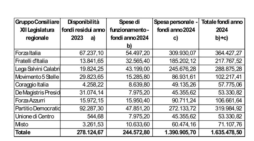 Per quanto riguarda le spese, buona parte di quella complessiva – 39 milioni impegnati sui 37 previsti – riguarda il programma “Organi istituzionali” che – si specifica nella relazione al Rendiconto del Consiglio regionale – «comprende le voci di spesa che si riferiscono alla politica, in quanto relative al pagamento: delle indennità dei consiglieri e degli assessori regionali; le spese per i servizi assicurativi dei consiglieri regionali; dell’Irap; dei vitalizi e delle reversibilità; dei contributi per il funzionamento dei gruppi consiliari compreso il personale assunto dagli stessi; delle spese per consulenze; delle spese di rappresentanza. Sono, altresì comprese le spese per manifestazioni e convegni; le spese per organismi autonomi e comitati, tra cui il Co.Re.Com. Calabria, la Commissione Pari Opportunità, il Garante regionale per l’Infanzia e l’Adolescenza e il Garante regionale per i diritti delle persone detenute o private della libertà personale; le consulenze, la quota di partecipazione alla Conferenza dei Presidenti delle Assemblee legislative delle Regioni e delle Province Autonome; le spese per la Conferenza interregionale per il coordinamento delle politiche dell’Area dello Stretto; l’Associazione ex consiglieri ed il rimborso ai componenti del Cal (Consiglio delle autonomie locali). Sono comprese, inoltre, in questo programma le spese per il personale dipendente assegnato all’Area Processo Legislativo e Assistenza Giuridica, al Co.Re.Com., ai Settori di supporto alle Commissioni consiliari, al Settore Assistenza Giuridica, al Settore Segreteria Ufficio di Presidenza e al Settore Segreteria Assemblea e Affari Generali, nonché le spese per il personale addetto alle segreterie politiche». Non c’è il dettaglio per quanto riguarda alcune voci, ma il trend lo si può ricavare dagli altri documenti di bilancio del Consiglio regionale, che da anni attestano in media una spesa di oltre 2 milioni per le indennità (in pratica gli stipendi) e i rimborsi per i consiglieri regionali a cui vanno aggiunti oltre 2,5 milioni per le spese per l’esercizio del mandato, una spesa di oltre 8 milioni per i vitalizi e di 1,5 milioni per la reversibilità. Quanto alle “strutture speciali” secondo quanto emerge dal Previsionale si può notare che solo per il personale esterno assegnato presso le strutture speciali si prevedeva per il 2024 una spesa di 3,9 milioni. Nel Rendiconto invece si fa esplicito riferimento alla spesa per i gruppi del Consiglio regionale (nella tabella in basso il dettaglio partito per partito), spesa che nel 2024 è stata pari complessivamente a 1,6 milioni, in gran parte assorbita da quella per il personale che vi lavora (1,390 milioni, la spesa di funzionamento è pari a 244mila euro): si annota che la regolarità dei rendiconti dei singoli gruppi è stata accertata dalla Corte dei Conti.
