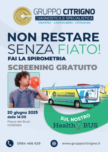 COSENZA Domani, venerdì 20 giugno, dalle ore 16:00 alle 19:30, arriva in Piazza dei Bruzi a Cosenza l’evento “Non restare senza Fiato”, una nuova tappa della campagna di prevenzione promossa dal Gruppo Citrigno. L’iniziativa offrirà screening gratuiti delle funzionalità respiratorie, attraverso l’esame di spirometria, a tutta la cittadinanza. Il test consente di valutare la salute dell’apparato respiratorio e di individuare precocemente
