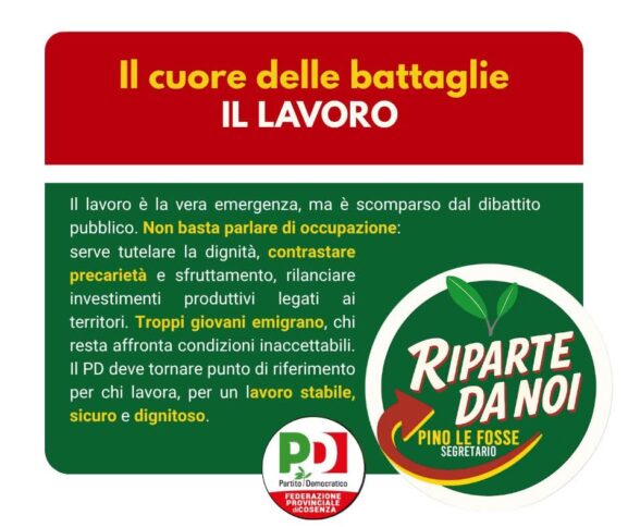 Le Fosse, indicato dall’area Adamo-Capalbo-Mazzuca, ha diffuso la sua prima dichiarazione programmatica sul lavoro, che a suo dire «è scomparso dal dibattito pubblico, ma resta la prima vera emergenza. Non basta parlare di occupazione, bisogna difendere la dignità, contrastare precarietà e sfruttamento, promuovere investimenti produttivi legati ai territori e ai loro saperi. Il lavoro manca o è precario, e quando c’è, spesso è ormai un lavoro povero. Troppi giovani – scrive Le Fosse – lasciano questa terra per cercare altrove dignità e futuro. Chi resta, spesso è costretto a condizioni inaccettabili. Occorre ridare centralità alla questione del lavoro, non con parole, ma con azioni: più tutela, più difesa di quello che c’è, più investimenti produttivi legati ai territori e ai loro saperi. Il Pd deve tornare ad essere riferimento per chi lavora, per il diritto ad un lavoro stabile, sicuro e dignitoso, per chi è sfruttato o precario, per chi non riesce a trovarlo ma non può comunque rimanere escluso» conclude Le Fosse.