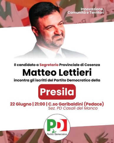 Il sindaco di Celico – nome indicato dalla piattaforma Innovazione, Comunità, Territori e sostenuto dai Democratici per la Calabria oltre che dalla corrente Bevacqua-Iacucci – invece parte dal feudo di provenienza, la Presila (già) rossa dove conta di raccogliere preferenze: ieri ha iniziato da qui «un nuovo percorso, proprio lì dove sono cresciuto: la Presila. Nel territorio che mi ha formato e che mi ha dato tanto, anche dal punto di vista politico». Prima tappa la sezione storica del Partito democratico di Pedace – oggi sede del circolo di Casali del Manco – «simbolo di resistenza, impegno e comunità. Un luogo che conserva ancora la memoria e l’eredità politica di figure straordinarie come Rita Pisano, Cesare Curcio e Peppino Cipparrone che hanno fatto la storia della presila e della Calabria. Un territorio che ha dato i natali a tantissimi partigiani ed antifascisti, a personaggi come Fausto Gullo, che hanno costruito questo paese per renderlo libero e democratico. Inizia un nuovo tempo!»