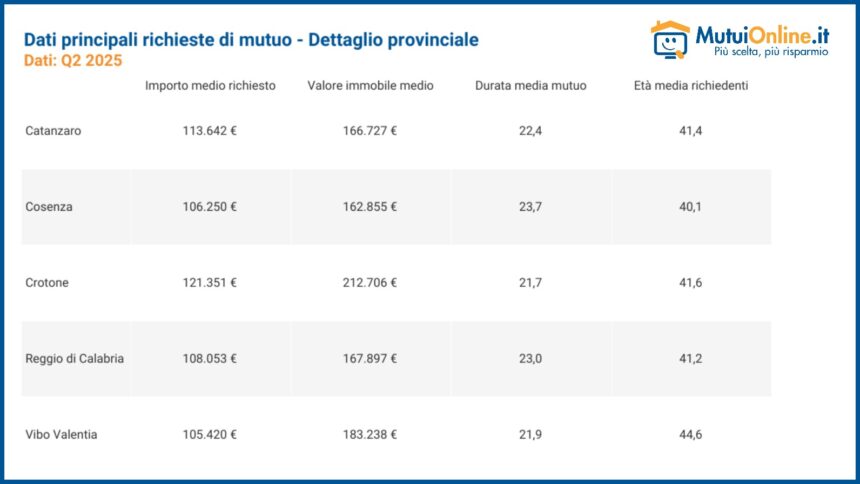 Se il tasso variabile risulta oggi più conveniente, secondo i dati dell’Osservatorio di MutuiOnline.it la stragrande maggioranza dei consumatori in Calabria continua a preferire la sicurezza del tasso fisso, che assorbe il 98,9% del totale delle richieste nel secondo trimestre dell’anno, dato in leggera flessione rispetto al trimestre precedente quando era al 99,9% del mix. L’ultimo taglio da parte della Bce, tuttavia, non ha ancora avuto effetti visibili sui dati relativi al tipo di tasso scelto, che risentiranno della decisione di Francoforte a partire dai prossimi mesi. Per quanto riguarda il tasso variabile, complice il deciso calo del TAN medio rispetto a inizio anno le richieste per questa tipologia di finanziamento nella regione sono aumentate, passando dallo 0,1% del totale nello scorso trimestre allo 0,6% di quello in corso. Per quanto riguarda le finalità di finanziamento, in Calabria nel secondo trimestre del 2025 oltre la metà delle richieste (59,2% del totale) sono dirette verso l’acquisto della prima casa, mentre la surroga assorbe il 25,3% del mix delle domande. Seguono più staccate tra le finalità di finanziamento l’acquisto della seconda casa, al 9,3% del totale, la ristrutturazione (3,4%) e il consolidamento (2,9%). In leggero calo l’importo medio richiesto nella regione rispetto al primo trimestre dell’anno, con il dato che dai 108.700 € scende a 107.400 € nel secondo, e anche il valore medio degli immobili passa dai 167.900 € dei primi 3 mesi dell’anno ai 165.500 € attuali. La durata dei finanziamenti in Calabria, invece, aumenta leggermente questo trimestre, attestandosi a 22 anni e 11 mesi in media contro i 22 anni e 7 mesi del periodo gennaio-marzo, e anche l’età media dei richiedenti cresce, passando da 40 anni e 5 mesi a 41 anni e 3 mesi. Nel secondo trimestre del 2025, Crotone è la provincia dove gli immobili sono più cari di tutta la Calabria (oltre 212.700 € in media) e dove l’importo medio richiesto da chi vuole accendere un mutuo è maggiore (121.351 €). La provincia dove si chiede meno capitale alla banca è invece Vibo Valentia (105.420 € in media) mentre il valore medio degli immobili più basso della regione si registra a Cosenza, dove si attesta a 162.855 € in media. Nella medesima provincia la durata media dei mutui richiesti è la più alta della regione, con 23 anni e 8 mesi, e l’età media dei richiedenti è più bassa (40 anni e 2 mesi), mentre in quella di Crotone si registrano finanziamenti i più brevi, con un dato medio di 21 anni e 8. Infine, in provincia di Vibo Valentia i richiedenti hanno l’età media maggiore della regione: 44 anni e 7 mesi.