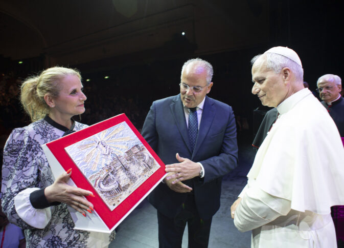 Il maestro orafo insieme alla moglie hanno avuto l’onore di consegnare il bassorilievo al Santo Padre, il quale ha molto apprezzato l’opera e il suo significato. Con questa ennesima creazione, Michele Affidato conferma un legame profondo e duraturo con la Chiesa, frutto di un impegno artistico che si rinnova da anni. Quella donata in occasione del Giubileo non è l’ultima opera, ma l’ennesima di una lunga serie di commissioni ricevute da vari organismi della Santa Sede. Per lo stesso Papa Leone XIV sono già state realizzate significative creazioni mentre altre sono in fase di realizzazione. Un percorso unico, che testimonia non solo la qualità artistica del suo lavoro, ma anche la profonda sintonia spirituale con il messaggio della Chiesa. Affidato e suo figlio Antonio, da anni protagonisti nel panorama dell’arte sacra contemporanea, sono oggi considerati artisti di riferimento. La consegna dell’opera al Pontefice ha assunto un significato ancor più simbolico per l’artista calabrese, definito “l’orafo dei Papi” che ha avuto l’onore di incontrare e lavorare per gli ultimi quattro Pontefici: San Giovanni Paolo II, Benedetto XVI, Papa Francesco e oggi Papa Leone XIV. Tra gli incarichi più significativi ricevuti per la realizzazione di opere di arte sacra figurano i nuovi diademi per la Madonna di Czestochowa, Regina della Polonia, molto cara a San Giovanni Paolo II, realizzati per il 300° anniversario della prima incoronazione. L’incarico ricevuto dalla Segreteria di Stato di produrre delle opere per Papa Francesco ispirate al suo Magistero Pontificio, sculture, destinate a Capi di Stato, di Governo, Ministri e autorità religiose di tutto il mondo. E ancora il prestigioso incarico conferito dalla CCEE, per la realizzazione di bassorilievi in argento, simbolo del Giubileo del CCEE, raffiguranti i Santi Patroni d’Europa, per il 50° Anniversario dell’Istituzioni del Consiglio delle Conferenze Episcopali d’Europa. Opere consegnate a Papa Francesco, al Papa emerito Benedetto XVI, a diversi Cardinali, Vescovi ed infine nel Palazzo del Quirinale al Presidente della Repubblica italiana, Sergio Mattarella. “Partecipare a questo evento e incontrare il Santo Padre è stata un’esperienza toccante e indimenticabile – ha dichiarato Michele Affidato – Le nostre opere nascono dal desiderio di comunicare messaggi di fede, speranza e accoglienza. Valori che sentiamo profondamente nostri e che, attraverso l’arte, desideriamo condividere con gli altri. Mettere la nostra creatività al servizio della Chiesa è per noi un autentico onore”.