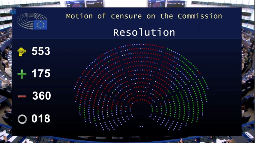 La mozione di censura che era stata presentata dai partiti di estrema destra contro la Commissione di Ursula von der Leyen è stata bocciata, senza sorprese, oggi a Strasburgo, dalla plenaria del Parlamento europeo, con 360 voti contrari, 175 favorevoli e 18 astensioni. Il risultato è molto al di sotto della maggioranza richiesta per approvare una mozione di censura, pari a due terzi dei votanti (che erano 553), e ad almeno la maggioranza assoluta degli eurodeputati (361).