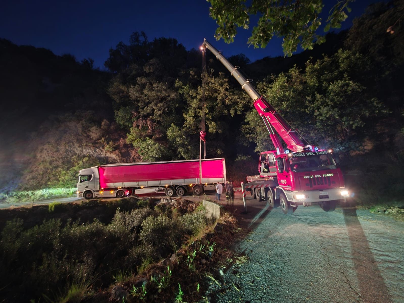 GROTTERIA Lungo e complesso l’intervento che questa notte ha visto impegnata la squadra dei vigili del fuoco di Siderno coordinata dal Capo squadra Natale Laface sulla strada provinciale 501 a Grotteria. Alle 23 circa di ieri, la chiamata alla sala operativa del NUE da parte dell’autista di un mezzo pesante, che chiedeva aiuto perché finito fuori strada. I soccorritori provenienti dalla sede di Siderno hanno immediatamente constatato l’impossibilità di poter operare in sicurezza a causa del pesante carico presente a bordo dell’autoarticolato che, per cause da accertare era finito fuori strada sfondando circa 20 metri di muretto guardrail. Solo il caso ha voluto che non precipitasse nella scarpata sottostante. Dopo circa 3 ore di certosino lavoro, con un gioco di cavi e rinvii in carrucola, i vigili del fuoco sono riusciti a rimettere il pesante automezzo in sicurezza sulla carreggiata.