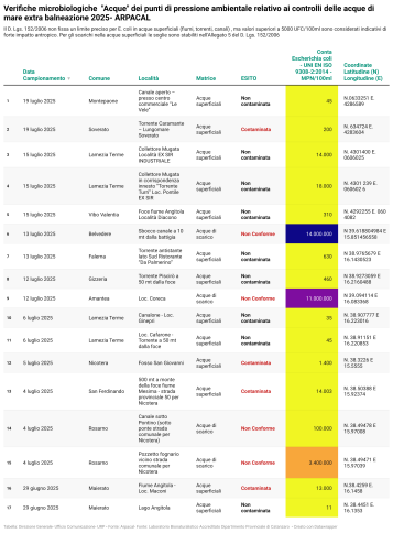 LAMEZIA TERME L’Agenzia Regionale per la Protezione dell’Ambiente della Calabria (ARPACAL), in stretta collaborazione con la Regione Calabria, Dipartimento Territorio e Tutela dell’Ambiente, sta conducendo un programma straordinario di controlli ambientali su tutto il territorio costiero e sui principali corpi idrici superficiali, con l’obiettivo prioritario di tutelare la salute dei cittadini e la qualità dell’ambiente naturale. L’attività, fortemente intensificata nel periodo della balneazione, si sviluppa parallelamente al monitoraggio di routine dei punti di balneazione previsto dalla normativa nazionale e riguarda decine di campionamenti straordinari sulle acque di mare, avviati su segnalazione diretta dei cittadini, anche attraverso il portale “Difendi Ambiente” e coinvolge tutte le potenziali fonti di pressione: scarichi, fiumi, torrenti e canaloni. (QUI I DATI)