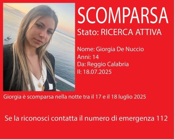 REGGIO CALABRIA È scomparsa nella notte tra il 17 e il 18 luglio 2025 Giorgia De Nuccio, una ragazza di appena 14 anni residente a Reggio Calabria. La giovane non ha più fatto ritorno a casa e i familiari, preoccupati, hanno immediatamente lanciato l’allarme. Le autorità hanno avviato le ricerche, mentre il caso è stato segnalato anche tramite i canali ufficiali di emergenza. Al momento non si esclude alcuna ipotesi e ogni informazione utile potrebbe rivelarsi fondamentale.