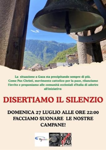 Questo il post apparso nel primo pomeriggio sulla pagina facebook della Parrocchia di Sant’Aniello (in foto di copertina) e ripreso da altre comunità parrocchiali e singoli cattolici e non: «Gaza muore di fame. Anche noi disertiamo il silenzio. In comunione con tante realtà, chiese e persone che non vogliono restare in silenzio di fronte al dramma che si sta consumando a Gaza, anche la nostra parrocchia parteciperà al gesto simbolico del suono delle campane. Domenica 27 luglio alle ore 22.00, suoneremo a distesa le campane della nostra chiesa come grido di pace, di vicinanza e di preghiera. Un gesto semplice, ma carico di significato: per dire che la vita di ogni persona conta, per chiedere che tacciano le armi, per ricordare che non c’è giustizia senza umanità. Uniamoci nella preghiera per tutte le vittime, per i bambini, per le famiglie distrutte, per chi soffre. E perché chi ha potere scelga finalmente la via della pace. Facciamoci sentire. Anche il silenzio, a volte, può uccidere. Ma la speranza fa rumore». (fra.vel.)