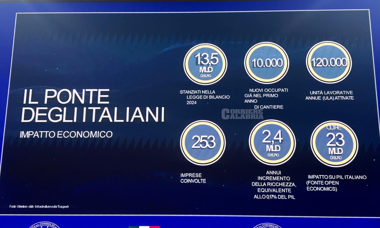Dalla campata unica della lunghezza di oltre 3 chilometri e larghezza di oltre 60 metri, il Ponte, da progetto, ospiterà 6 corsie stradali e due binari ferroviari, all’altezza delle torri di quasi 400 metri. Salvini ha sottolineato che «mai nella lunga storia dell’opera si era arrivati ad una fase approvativa così avanzata». L’opera – dal costo di 13,5 miliardi di euro – si inserisce, come spiegato, «in un più ampio programma di rilancio infrastrutturale promosso dal Ministero, con investimenti in strade e ferrovie tra Sicilia e Calabria del valore di 70 miliardi fino al 2032». Un rilancio economico per i territori coinvolti, più volte promesso dal vicepremier e ministro dei Trasporti nelle sue visite in Calabria e Sicilia negli ultimi anni. E nuove visite in riva allo Stretto sono imminenti. Salvini è infatti atteso questa sera a Messina e domani a Villa San Giovanni, alle ore 10, al Pilone in località Santa Trada.