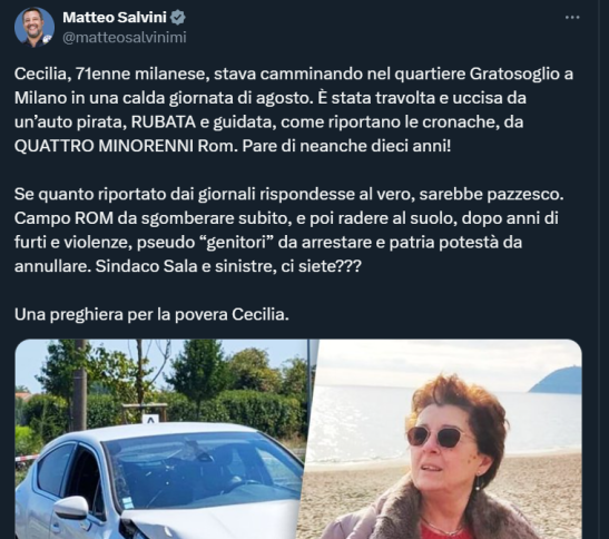 «Cecilia, 71enne milanese, stava camminando nel quartiere Gratosoglio a Milano in una calda giornata di agosto. È stata travolta e uccisa da un’auto pirata, rubata e guidata, come riportano le cronache, da quattro minorenni Rom. Pare di neanche dieci anni! Se quanto riportato dai giornali rispondesse al vero, sarebbe pazzesco. Campo Rom da sgomberare subito, e poi radere al suolo, dopo anni di furti e violenze, pseudo “genitori” da arrestare e patria potestà da annullare. Sindaco Sala e sinistre, ci siete???». Lo scrive sui social il leader della Lega, Matteo Salvini.