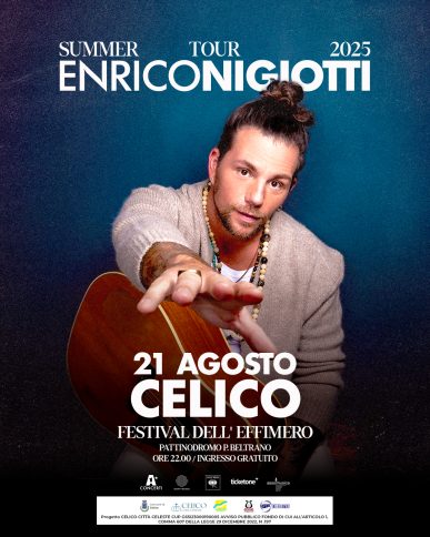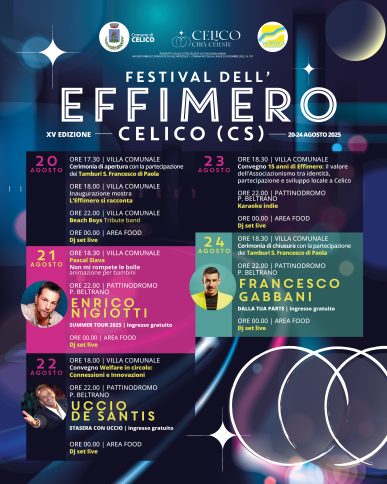 Il 23 agosto si aprirà alle 18.30 con il secondo degli incontri-dibattito in Villa: “15 anni di Effimero – Il valore dell’associazionismo tra identità, partecipazione e sviluppo locale a Celico”. Interverranno Matteo Lettieri, sindaco di Celico; Stefano Bafaro, delegato al Turismo del Comune di Celico e membro dell’Associazione Culturale SilAntica; Giancarlo Costabile, docente di Pedagogia dell’antimafia UniCal; Gianni Romeo, coordinatore CSVnet Calabria; Antonio Iaccino e Giada Imbrogno, membri dell’Associazione Culturale SilAntica. Modera Fabio Benincasa, giornalista. Alle 22.00, sempre nell’area concerti del Pattinodromo, ci si ritroverà per cantare insieme al Karaoke indie. La 15esima edizione del Festival dell’Effimero chiuderà il 24 sera, al pattinodromo di Celico, con Francesco Gabbani, che nei live di questa estate canta Dalla tua parte, l’album pubblicato subito dopo l’edizione di Sanremo 2025, dove si è esibito con Viva la vita. Cantautore e polistrumentista di Carrara, ha pubblicato sei album e ha collezionato ben 13 dischi di platino e 4 dischi d’oro. È stato il primo artista nella storia del Festival a vincere per due anni consecutivi, prima tra le Nuove Proposte con Amen, e poi tra i Big con Occidentali’s Karma, conquistando sei dischi di platino e battendo ogni record di visualizzazioni e streaming. Nel 2020 è arrivato secondo con Viceversa (3 dischi di platino). In scaletta, anche i brani meno recenti e più amati dal pubblico. Gabbani si accinge ora a entrare nel ruolo di giudice di X Factor 2025, in onda da metà settembre. Tutte le serate del Festival si chiuderanno con il DJ set live presente nell’area food. Questi gli eventi principali del Festival dell’Effimero, concepito inizialmente come evento per un solo giorno – e per questo effimero – e che nell’arco di 15 anni si è affermato tra le migliori rassegne e di grande richiamo in Calabria. L’evento si inserisce nel programma di più ampio respiro “Celico città celeste”, legato alla storia dell’Abate Gioacchino da Fiore, che qui nacque nel 1130. Attorno alla sua figura sono nati percorsi che conducono i viaggiatori alla scoperta della simbologia gioachimita e dei luoghi dove l’Abate elaborò il suo pensiero filosofico. Da percorrere, un itinerario che è insieme turistico, culturale e religioso da Celico fino a San Giovanni in Fiore, dove fu indicata l’edificazione dell’Abbazia, con lo spirito di far conoscere gli aspetti legati alla personalità dell’Abate, al suo passaggio, per scoprire soprattutto l’attualità del suo pensiero.