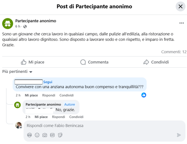 “Sono un giovane che cerca lavoro in qualsiasi campo, dalle pulizie all’edilizia, alla ristorazione o qualsiasi altro lavoro dignitoso. Sono disposto a lavorare sodo e con rispetto, e imparo in fretta“. L’annuncio viene subito intercettato da un utente che risponde “Convivere con una anziana autonoma buon compenso e tranquillità?“. La risposta è lapidaria: “No, grazie“. La ricerca continua, la proposta viene rispedita al mittente.