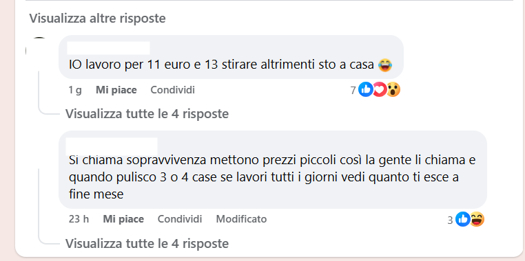 Non mancano le discussioni sulle paghe (da fame) per chi pubblica un annuncio destinato agli addetti alle pulizie. “Buonasera a tutti cerco una persona sia per la pulizia che per stirare con 8 euro l’ora chi è disponibile commenti sotto che scrivo poi io in privato“. Le risposte sono tutte negative rispetto ai danari proposti. “8 euro sono pochi, almeno 10, siamo 21esimo secolo, guardate i prezzi nei supermercati” fa notare un utente. Più duro il tono di un altro frequentatore di gruppi social. “A 8 euro l’ora te li fai da sola. Minimo 10 euro l’ora, in più è un lavoro saltuario, questo è sfruttamento. Ovviamente la gente accetta per bisogno e lo capisco ma almeno il minimo sindacale“. Ed ancora, “Io non esco nemmeno da casa per 8 euro?“. Il dibattito si fa rovente, si arriva addirittura alla decisione di impedire la pubblicazione di commenti. Qualcuno indispettito rincara la dose. “Cari amici, qua vedo che le gente fanno pulizie per 7 e 8 euro all’ora, ma sono scioccata, vorrei sapere come campate, come sopravvivete, come pagate le spese, affitto, luce, acqua con 7 e 8 euro? Come mangiate, vestite e cosa fate? Io 15 anni fa prendevo per pulizie e stirare 7 e 8 euro, oggi sono arrivata a 12 e 13 e volevo dire che pagano, paga chi vuole la signora delle pulizie, alzate un po’ voce, chiedete di più e vi daranno, vi auguro a tutti la vita serena e felice”. Chi aveva deciso di disattivare le risposte al post pubblicate, chiude il discorso. “Ho disattivato perché non ce la facevo più a leggere certe commenti. Auguro a tutti di essere ben pagati, come desiderato per vivere meglio, serena senza fare notti bianchi con il pensiero di cosa dare da mangiare ai bambini, come gestire la vita”.