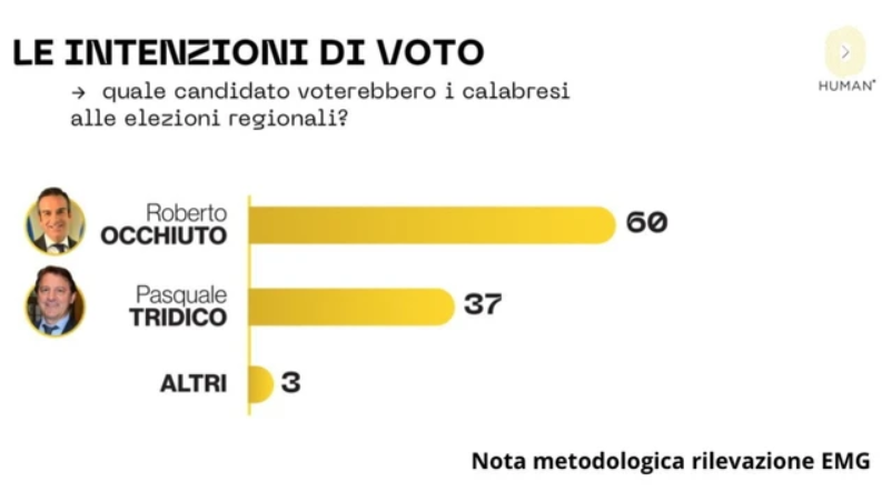 Su un campione di 1.000 intervistati, il 60% afferma di voler votare il presidente uscente. A Tridico il 37% dei consensi