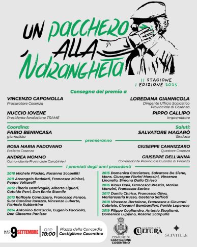 CASTIGLIONE COSENTINO Domani alle 18, il Comune di Castiglione Cosentino – in provincia di Cosenza – ospita la undicesima edizione dell’evento “Un pacchero alla ’ndrangheta”, nel corso del quale saranno premiati Vincenzo Capomolla Procuratore di Cosenza, l’imprenditore Pippo Callipo, Loredana Giannicola Dirigente dell’Ufficio Scolastico Regionale della Calabria e Nuccio Iovene presidente della Fondazione trame. La serata si aprirà con i saluti del sindaco Salvatore Magarò, a moderare l’incontro il giornalista del Corriere della Calabria Fabio Benincasa.