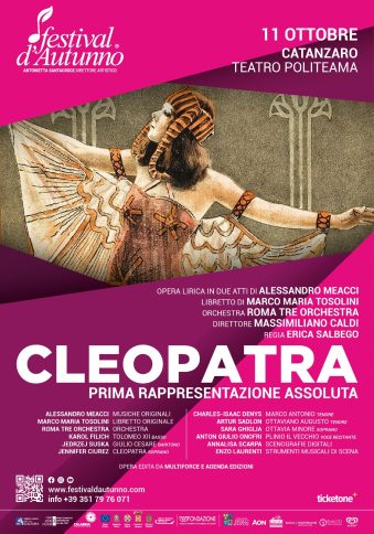 Sabato 11 ottobre, sarà un momento storico per il melodramma italiano. Il Teatro Politeama ospiterà infatti la prima assoluta di “Cleopatra”, una nuova opera lirica commissionata dal Festival d’Autunno al compositore Alessandro Meacci e coprodotto con Roma Tre Orchestra, diretta per l’occasione da Massimiliano Caldi, musicista con una ampia esperienza internazionale sia in campo sinfonico che operistico.