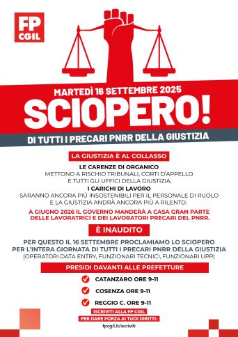 La Funzione Pubblica Cgil aderisce allo sciopero nazionale dei lavoratori e delle lavoratrici della giustizia con presidi davanti alle prefetture di Catanzaro, Cosenza e Reggio Calabria che si terranno martedì 16 settembre dalle ore 9 alle ore 11. «Focus della protesta – spiega una nota – il destino dei lavoratori assunti con Fondi Pnrr e per i quali il governo ha deciso, dopo anni di precarietà, il termine del rapporto di lavoro a giugno 2026. Si tratta di funzionari UPP, funzionari tecnici, operatori data entry. Una prospettiva a cui fa opposizione il sindacato rilanciando l’allarme sociale che scaturirebbe dalla perdita di una fonte di reddito per centinaia di famiglie e l’emorragia che ne deriverebbe per un sistema giudiziario già al collasso e con profonde pecche. La carenza di personale al ministero della Giustizia – si fa rilevare – al 31.12.24 è di 15mila addetti. Tra il 2025 e il 2026 andranno in pensione circa cinquemila addetti. In Calabria sono 850 i precari Pnrr e 350 i precari part time a 18 ore assunti con obiettivo convergenza a cui scadrà il contratto a marzo 2026. Sono tutti necessari a far funzionare gli uffici giudiziari. L’arretrato recuperato con i precari si attesta ad un più 20%, questo dà la misura del loro prezioso contributo. Chiediamo la stabilizzazione dei precari a fronte, non solo di una dignità del lavoro ormai sempre più vilipesa, ma affinché – conclude la Fp Cgil – si pongano le basi per una giustizia efficiente e accessibile».