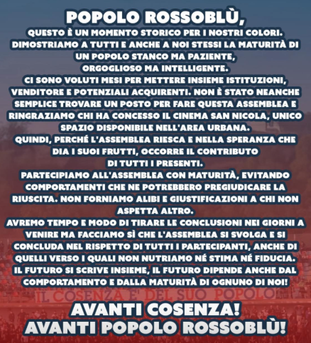 COSENZA Oggi pomeriggio, alle ore 18, presso il Cinema San Nicola, si terrà un’assemblea pubblica molto attesa dal popolo rossoblù. Un momento definito “storico” dagli stessi organizzatori, che hanno diffuso un appello rivolto a tutti i tifosi del Cosenza Calcio affinché la partecipazione sia ampia, matura e costruttiva.
