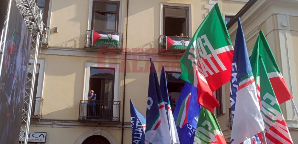 LAMEZIA TERME Non è una cosa di tutti i giorni che bandiere dei partiti di centrodestra e bandiere che inneggiano alla Palestina sventolino a distanza di pochi metri le une dalle altre. Accade a Lamezia Terme, su Corso Numistrano, teatro della convention del centrodestra – con la premier Giorgia Meloni e i vicepremier Antonio Tajani e Matteo Salvini – a sostegno del candidato presidente della Regione Roberto Occhiuto. Nell’attesa dell’arrivo dei big infatti i militanti di centrodestra, soprattutto di Fratelli d’Italia, hanno iniziato a sventolare i loro vessilli sotto il palco: sopra il palco, su due balcono sono invece esposte due bandiere “Free Palestina”.