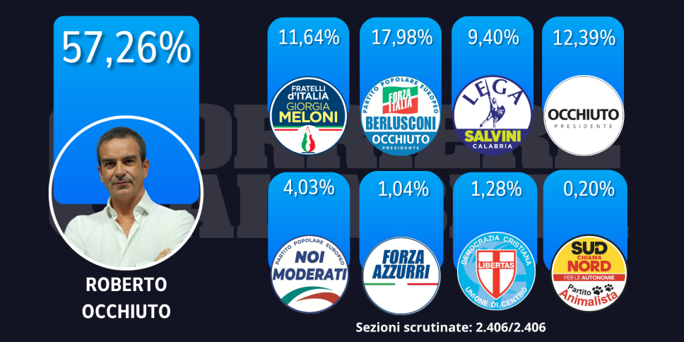 LAMEZIA TERME Roberto Occhiuto al 57,26%, , Forza Italia primo partito con circa il 17,98%. Questi in sintesi i principali dati al completamento dello scrutinio delle Regionali aggiornati sul portale Eligendo del ministero dell’Interno. Nel centrodestra si conferma il primato di Forza Italia (17,98%) : la seconda lista più votata è quella di Occhiuto Presidente (12,39%), comunque orbitante in Forza Italia. A seguire Fratelli d’Italia all’11,64%, Lega al 9,4%. Supera il quorum Noi Moderati (4,03%). Sotto il quorum invece Udc (1,28%), Forza Azzurri (1,04%), Sud Chiama Nord (0,2%).