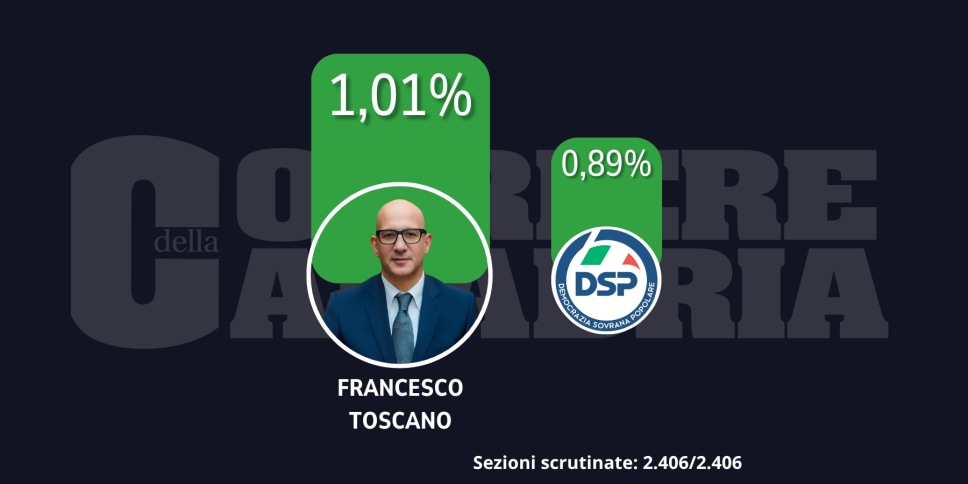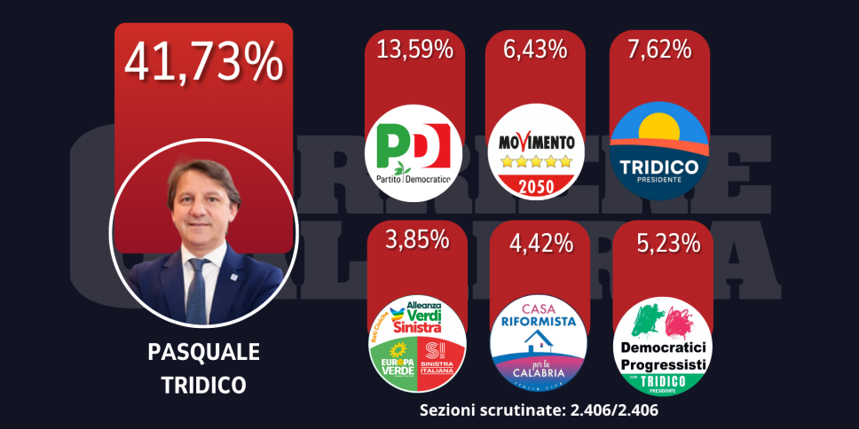 Nel centrosinistra, con Tridico al momento al 41,73%, il partito più votato è il Pd, con il 13,59% (il secondo partito più votato in assoluto), la lista Tridico Presidente al 7,62%, il M5S si attesta al 6,43%, Democratici Progressisti al 5,23% Casa Riformista al 4,42%. Non raggiungere il quorum al momento Avs (3,85%). Tocca l’101% Francesco Toscano, candidato presidente per Democrazia Sovrana Popolare la cui lista si ferma allo 0,89%. (a. c.)