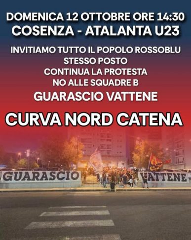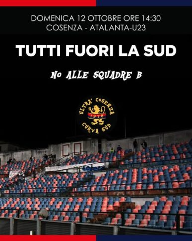 Entrambe le curve ieri hanno però annunciato la loro presenza all’esterno dello stadio in occasione della sfida odierna tra Cosenza e Atalanta Under 23, invitando i tifosi rossoblù a partecipare per lanciare un ulteriore segnale di dissenso nei confronti della società. Un messaggio chiaro anche contro le squadre B, come le Under 23 di Atalanta, Juventus, Milan e Inter, la cui presenza nei campionati professionistici continua a suscitare forte opposizione nel mondo ultras.