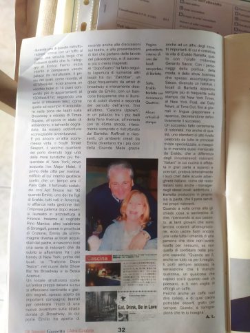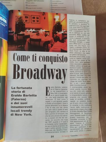 Il nastro si riavvolge e arriva agli anni Ottanta e Novanta, quelli in cui, tra un maxicantiere e un altro, nascono pizzerie sparse per Manhattan (il gruppo Barletta arriverà ad averne 36, «in una notte ripulivamo un magazzino di un palazzo che stavamo ristrutturando, poi bastavano acqua, farina e un forno per avviare una nuova pizzeria») e ristoranti di alta cucina: Buon Appetito in Bleecker street, o Dopo Teatro vicino a Times Square (44esima strada tra sesta e settima avenue), frequentato soprattutto dagli attori di off Broadway. «Ma nei miei locali, per trent’anni ho portato anche le maestranze messicane che lasciavano tardi il cantiere con me e non potevano rientrare a casa, erano tutti miei ospiti. Loro prendevano la paieda (paella, ndr), io la stecca (steack, bistecca). Sai, nella fame c’ero passato e sapevo cosa significava non avere il latte per tuo figlio. Piuttosto mi facevo prestare i soldi per pagare i miei dipendenti e a Natale c’era un regalo per tutti dalla lavapiatti allo chef al contabile che non ho mai cambiato in 47 anni». La mente va a Brode, polacco, «così legato a me da prendere l’aereo per venire al funerale di mio fratello Giovanni, in Italia. Ho sempre rispettato i miei collaboratori. Penso che la manodopera in un’impresa sia importante tanto quanto il padrone».