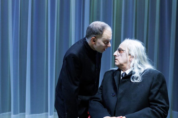 Protagonisti di “Finale di partita” sono Hamm, cieco e paralizzato sulla sua sedia a rotelle, Clov, che non può piegare le gambe ed è costretto a stare sempre in piedi, e gli anziani genitori del primo, Nagg e Nell, senza gambe e che vivono ognuno dentro un bidone della spazzatura.
