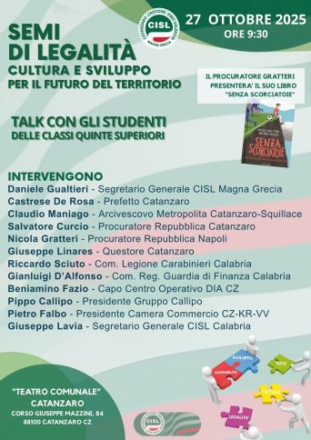Un confronto diretto tra magistrati, istituzioni, forze dell’ordine, mondo del lavoro e studenti per riflettere insieme sul valore della legalità e della responsabilità civile. È questo lo spirito dell’iniziativa “Semi di legalità – Cultura e sviluppo per il futuro del territorio”, organizzata dalla CISL Magna Grecia, che si terrà lunedì 27 ottobre alle ore 9.30 al Teatro Comunale di Catanzaro.