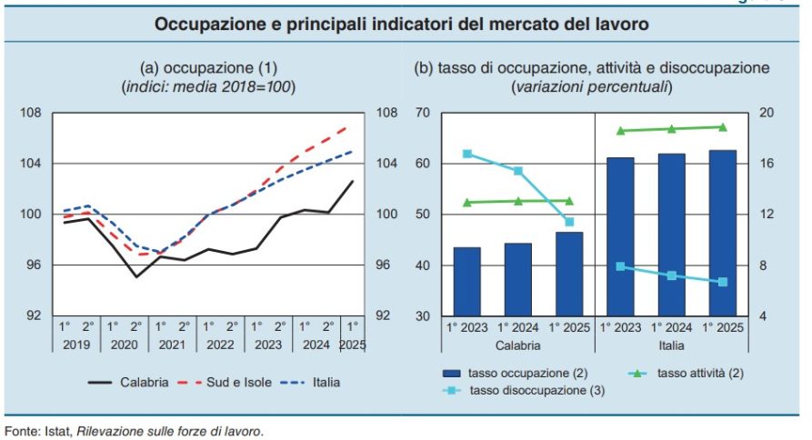 Da rimarcare, secondo il report della Banca d’Italia, il “balzo” nel mercato del lavoro, considerando che – si legge – «nel primo semestre del 2025, l’occupazione in regione ha continuato a crescere, con il numero degli occupati in Calabria aumentato del 5% rispetto allo stesso periodo del 2024. L’incremento risulta significativamente superiore a quello osservato in Italia e nel Mezzogiorno (rispettivamente 1,4 e 2,2%)», anche se ancora insufficiente a colmare il divario rispetto alle due aree di riferimento. Per Bankitalia il tasso di occupazione ha raggiunto il 46,5% (era il 44,3 nello stesso periodo del 2024), e si riscontra una sensibile riduzione del tasso di disoccupazione, all’11,4% (dal 15,4 dello stesso periodo del 2024). «I dati dell’Osservatorio sul mercato del lavoro dell’Inps relativi al settore privato – spiega ancora l’istituto – confermano la dinamica positiva nel lavoro subordinato. Distinguendo per tipologie contrattuali, l’incremento è attribuibile quasi esclusivamente alle posizioni a tempo indeterminato, mentre il ricorso ai contratti a termine si è leggermente ridotto». Anche per questo nel primo semestre del 2025 – aggiunge Bankitalia – «la crescita del reddito è proseguita, continuando a beneficiare della dinamica positiva dell’occupazione, con un aumento del 3,8% rispetto allo stesso periodo dell’anno precedente (3,0 nella media nazionale).