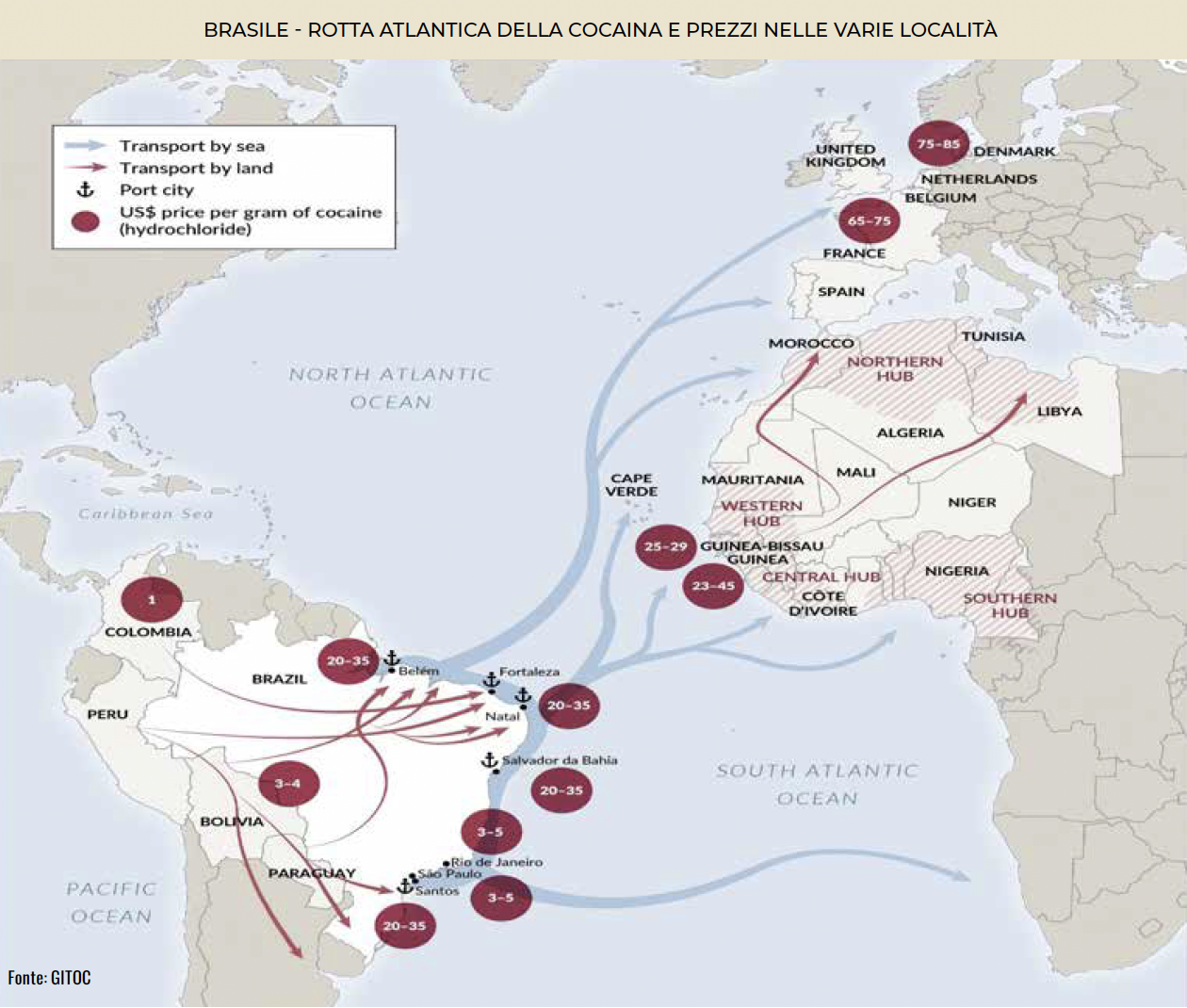 In Brasile il traffico di cocaina è gestito da potenti organizzazioni criminali operanti sul territorio, tra cui il Primeiro Comando da Capital (PCC) e il Comando Vermelho. Le pericolose organizzazioni brasiliane collaborano ormai stabilmente con broker appartenenti alla ‘ndrangheta, oltre che a gruppi criminali europei, albanesi e serbi. Una sinergia criminale cristallizzata dalle evidenze investigative e resa ancora più facile dalla conformazione del territorio brasiliano, come evidenziato nel rapporto.