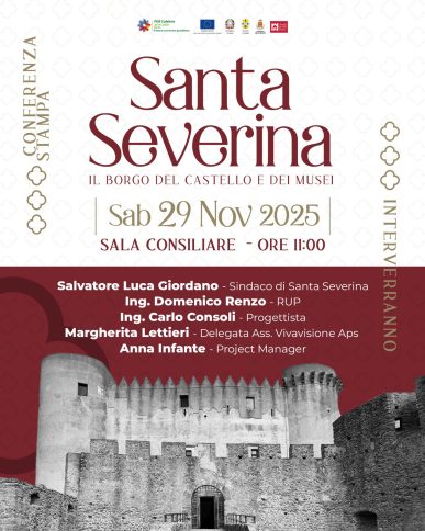 Alla conferenza stampa interverranno il sindaco di Santa Severina, Salvatore Giordano, il Rup, ingegner Domenico Renzo, il progettista, ingegner Carlo Consoli, Margherita Lettieri, delegata Associazione Vivavisione Aps e Anna Infante, Project Manager.