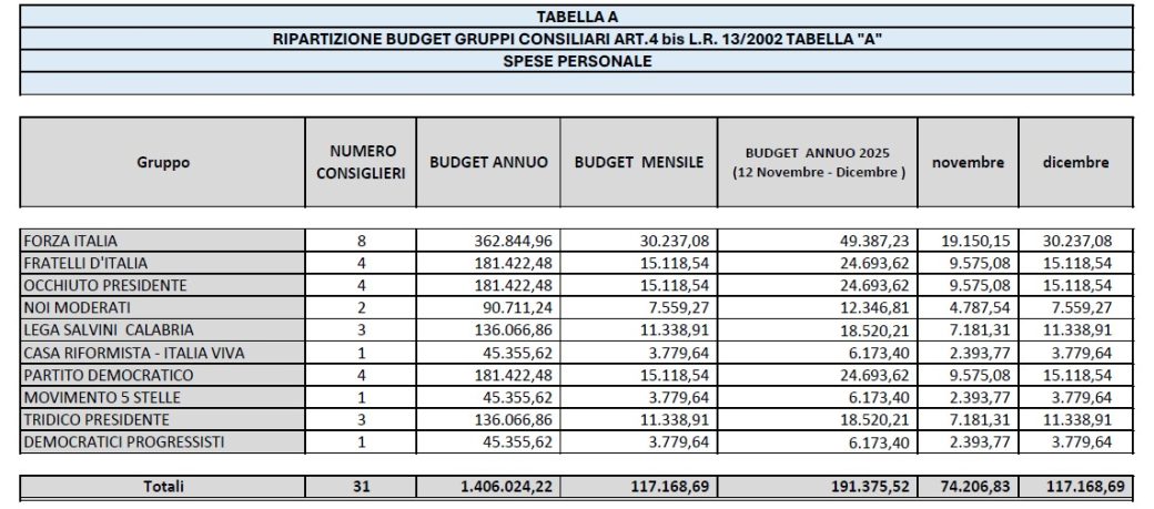 REGGIO CALABRIA È pari a oltre 1,4 milioni complessivi il budget annuale a disposizione dei gruppi del Consiglio regionale per la spesa del personale. Lo prevede una delibera dell’Ufficio di presidenza di Palazzo Campanella, che ha definito il tetto massimo della spesa annua e la ripartizione tra i gruppi consiliari. Ovviamente la “parte del leone” la fa Forza Italia (che ha otto consiglieri regionali), con un budget annuo fissato in oltre 362mla euro. Seguono nell’ordine Fratelli d’Italia, Occhiuto Presidente e Pd (quattro consiglieri) con oltre 181mila euro, Lega e Tridico Presidente (tre consiglieri) con oltre 136mila euro, Noi Moderati (due consiglieri) con oltre 90mila euro, Movimento 5 Stelle, Casa Riformista, Democratici Progressisti (un consigliere) con oltre 45mila euro. Ovviamente si tratta di una ripartizione suscettibile di variazioni alla luce delle prevedibili variazioni della composizione dei gruppi, come a esempio avverrà per le dimissioni di Pasquale Tridico, che porteranno in aula un secondo consigliere in quota M5S. Il calcolo complessivo viene effettuato sul costo di una unità categoria D, pari a oltre 45mila euro, moltiplicato per 31 consiglieri. (c. a.)
