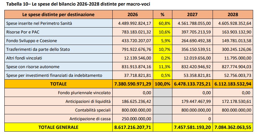 «La voce più rilevante del bilancio è rappresentata dalla spesa per la Sanità, che include le risorse del Fondo sanitario nonché tutte le ulteriori somme assegnate con vincolo di destinazione. Tali risorse ammontano complessivamente, in termini di competenza, ad oltre 4,5 miliardi di euro». Per quanto riguarda le altre risorse con vincolo di destinazione presenti nella parte spesa – specifica la Giunta – «parte di essa afferisce alle risorse del Por-Fesr e Fse plus 2021/2027 iscritte in bilancio (632,12 milioni di euro nel 2026, 387,43 nel 2027 e 162,25 milioni di euro circa nel 2028), del Fsc 21-27 (310,1 nel 2026, 256,53 nel 2027 e 149,78 nel 2028), al Fsc Nazionale (18,4 milioni nel 2026 e 5 milioni nel 2027) al FSC 2014/2020 – Piani Operativi (2 milioni di euro circa nel 2026), al Psc Sezione ordinaria e Speciale (88,68 milioni di euro nel 2026, 3,16 nel 2027), al Fsc Trasporti (14,5 milioni di euro nel 2026), e al Fondo di rotazione destinato all’attuazione del Pac 2014-2020 (circa 128,57 milioni di euro nel 2026)». (c. a.)