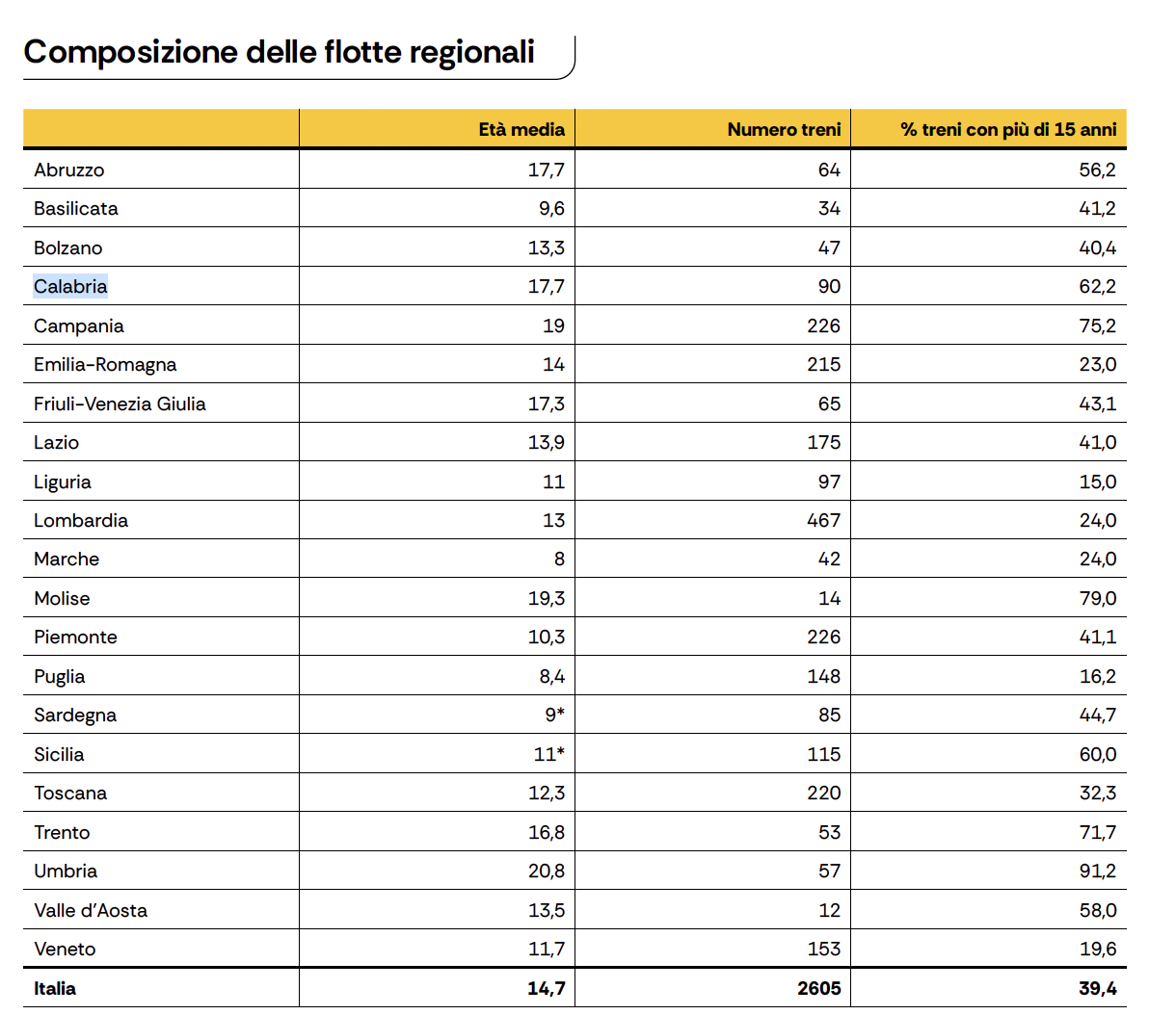Una fotografia che emerge dalla ventesima edizione di “Pendolaria”, il rapporto di Legambiente che analizza lo stato della mobilità su ferro nel Paese. I dati mostrano un primo segnale positivo: l’età media dei treni regionali in Calabria è in miglioramento, grazie ai contratti di servizio con Trenitalia e agli investimenti di Ferrovie della Calabria. Tuttavia, il gap con il resto d’Italia rimane profondo. Se la media nazionale è di 14,7 anni, in Calabria i vagoni hanno mediamente 17,7 anni. Ancora più preoccupante è il dato sulla vetustà: il 62,2% dei treni regionali calabresi ha più di 15 anni di servizio, contro una media del Mezzogiorno (16,6) e del Nord (13,2).