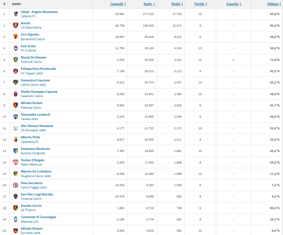 Molto positivo anche il dato del Nicola De Simone di Siracusa: stadio piccolo, ma spesso pieno, con una percentuale di utilizzo del 71,8% e un match sold out nel girone d’andata.