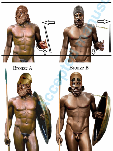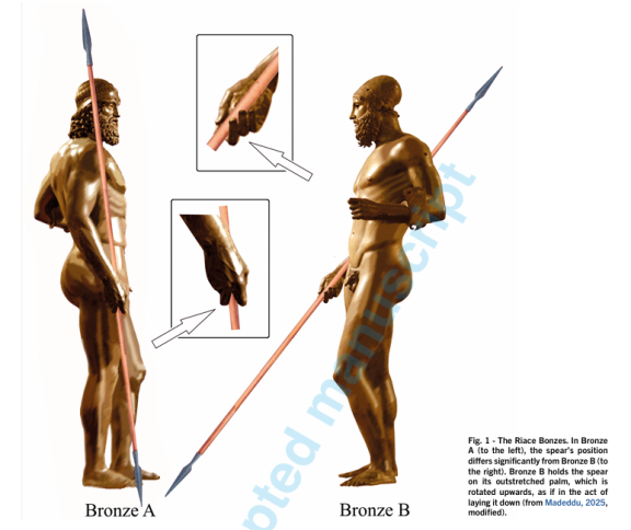 E poi c’è “l’analisi isotopica” del piombo nei perni che confermerebbe come i due bronzi, al tempo della ricollocazione, facessero parte dello stesso gruppo monumentale. Un altro pilastro dello studio è la revisione storico-ideologica. Gli autori ricordano che «solo un centro tirannico ultra-ricco come Siracusa nei decenni 480-460 a.C. poteva finanziare sculture in bronzo di quella scala, tipiche della propaganda dinastica dei Deinomenidi». La nudità eroica, il portamento, la corazza corinzia e gli attributi militari «richiamano la retorica sui vincitori di Himera, la battaglia che consacrò Gelone e Ierone sulla scena del mondo greco». Le proposte di Holloway (1988) e McCann (2002), che associavano i Bronzi a Gelone, a Ierone o al loro ambiente, vengono riprese e sostenute con nuovi elementi. La rilettura letteraria (Madeddu 2025) spinge a identificare il guerriero B proprio con Gelone nudo che depone le armi, come descritto da Claudio Eliano dopo la vittoria sui Cartaginesi.