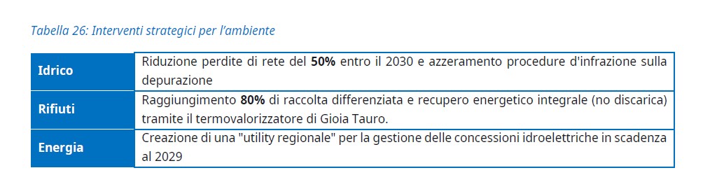 Tra le priorità per la Regione c’è la gestione delle risorse idriche. «L’acqua è la ricchezza del futuro. Il Piano d’Ambito idrico, del valore di 2,2 miliardi di euro, mira a ridurre le perdite di rete del 50% entro il 2030. Attraverso Sorical, la Regione gestirà l’intero ciclo, dalla captazione alla depurazione, azzerando le procedure di infrazione europee che costano milioni ai contribuenti». Annunciato anche un “giro di vite” in vista della scadenza delle concessioni idroelettriche nel 2029: «La Regione – si legge nel Defr della Giunta – costituirà una Utility regionale per riassumere la gestione degli invasi. L’obiettivo è offrire energia a costo calmierato alle imprese che decideranno di insediarsi in Calabria, rendendo il territorio attrattivo per industrie energivore e data center».