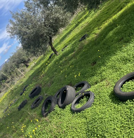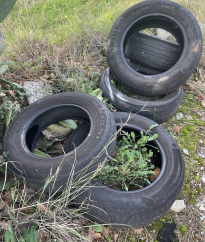 In località Bosco Amatello, zona ricca di oliveti, lo scempio di 27 gomme tra il bordo strada e un appezzamento di terreno