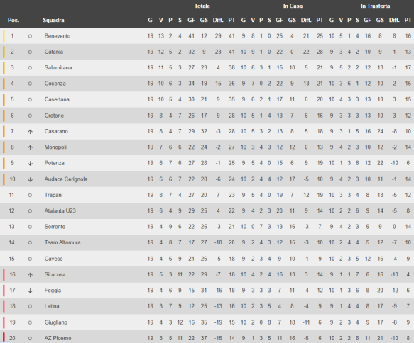 Diciannove giornate bastano per delineare le prime gerarchie nel girone C della serie C, un campionato che continua a vivere su equilibri sottili, dove la continuità vale spesso più dello spettacolo. In vetta Benevento e Catania, ma alle loro spalle il margine resta contenuto e le inseguitrici, soprattutto Salernitana e Cosenza, mostrano identità differenti e credibili.