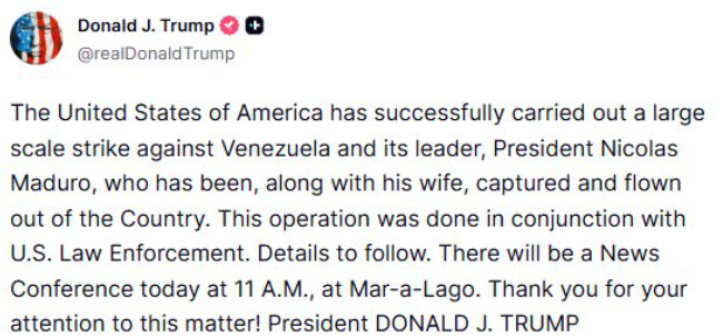 «Gli Stati Uniti d’America hanno condotto con successo un attacco su larga scala contro il Venezuela e il suo leader, il presidente Nicolas Maduro, che è stato catturato e portato fuori dal Paese insieme alla moglie. L’operazione è stata condotta in collaborazione con le forze dell’ordine statunitensi». Lo ha dichiarato il presidente degli Stati Uniti, Donald Trump, su Truth.