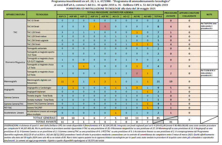 «Ricordiamo, a tal proposito – proseguono – che l’Agenas a sostegno del “Programma di ammodernamento tecnologico della Regione Calabria “approvato dal Generale Cotticelli con il DCA 183/2019 e successive modifiche testualmente scriveva: “L’ esigenza di sostituire 59 Apparecchiature è conseguenza dell’obsolescenza delle stesse la cui età è superiore a 7 anni”, tra queste l’Agenas rammentava 16 TAC, 18 Mammografi, 7 RMN, 10 Angiografi. Il Programma di ammodernamento prevedeva l’acquisto in tempi brevi, tenuto conto, tra l’altro, della mobilità passiva che superava allora e supera, tuttora, i 300 milioni di euro, di 85 “Grandi Apparecchiature”. Purtroppo Comunità Competente con i suoi report ha, più volte, segnalato alla Struttura Commissariale i notevoli ritardi delle procedure d’acquisto che sono ferme al 28 maggio 2025 e che hanno impegnato solo 34 milioni e 207 mila euro per 41 Apparecchiature Sanitarie. Ricordiamo che il “Programma Operativo 2022/25 prevedeva la sottoscrizione di tutti gli 85 contratti d’acquisto delle forniture entro il 31/03/2025! È necessario chiarire perché, a distanza di anni, l’Asp di Crotone ha acquistato 4 Apparecchiature su 10, l’Asp di Catanzaro 1 su 6, l’Asp di Cosenza 11 su 19, l’Asp di Vibo Valentia 3 su 6, l’Asp di Reggio Calabria 4 su 7, l’A.O. di Cosenza 3 su 5, l’AOU di Catanzaro 7 su 19, il GOM di Reggio Calabria 8 su 13 Apparecchiature. Vorremmo comprendere le ragioni e gli ostacoli che evidentemente si frappongono a livello Ministeriale? Regionale? Aziendale? Riteniamo che sarebbe opportuno fare chiarezza su una questione della massima importanza per la salute dei calabresi».