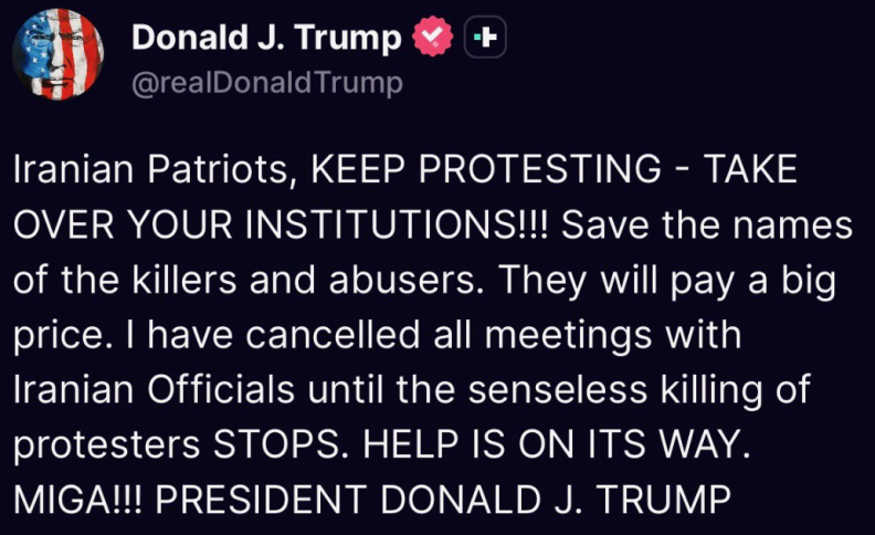“Patrioti iraniani continuate a manifestare. Prendete il controllo delle istituzioni. Salvate i nomi di chi uccide e abusa, pagheranno un prezzo alto. Ho cancellato tutti gli incontri con i funzionari iraniani. L’aiuto è in arrivo”. Lo afferma Donald Trump su Truth. (ANSA)