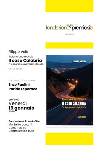 Occhi lucidi, forse, ma senza indulgenze retoriche! La Fondazione Premio Sila riparte nel 2026 con un primo appuntamento che guarda alle incoerenze della nostra Calabria. Venerdì 16 gennaio 2026, alle 18, nella sede di via Salita Liceo 14, cuore del centro storico di Cosenza, il giornalista e scrittore Filippo Veltri presenta il suo ultimo libro “Il brutto anatroccolo – Il caso Calabria. Tra degrado e narrazione fasulla”, pubblicato da Callive edizioni.