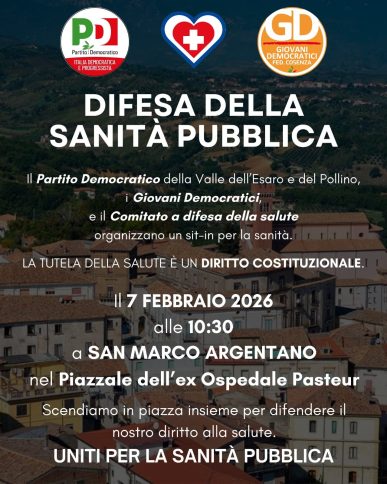 SAN MARCO ARGENTANO Il Pd della Valle dell’Esaro e del Pollino – Comitato a difesa della salute ha annunciato una manifestazione pubblica sabato 7 febbraio 2026, alle 10.30, a San Marco Argentano (nel Cosentino), per richiamare l’attenzione sulle criticità della sanità territoriale e chiedere interventi urgenti per i presidi della Valle dell’Esaro e del Pollino.