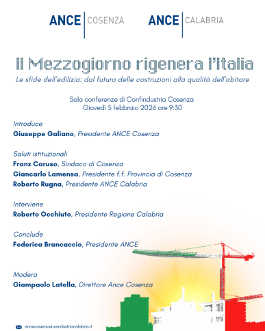 COSENZA “Il Mezzogiorno rigenera l’Italia. Le sfide dell’edilizia: dal futuro delle costruzioni alla qualità dell’abitare” è il suggestivo tema del convegno che si svolgerà giovedì 5 febbraio nella sede di Confindustria a Cosenza.